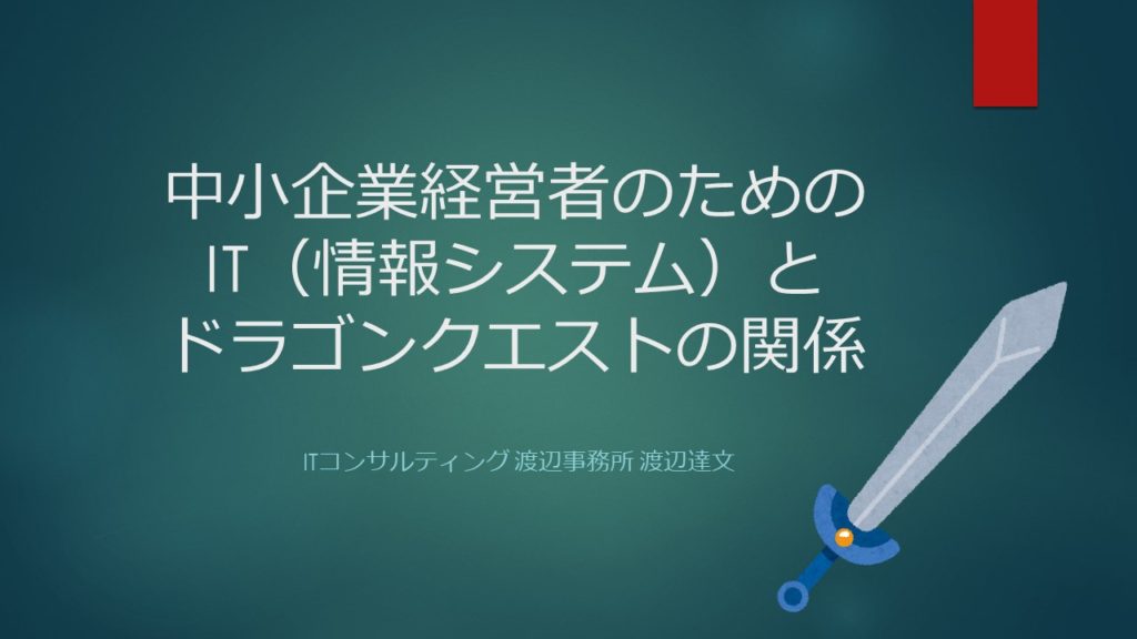 中小企業経営者のための情報システム活用講座公開済み 2018年10月22日 寸法 1280 × 720 in (インチ) 中小企業経営者のためのIT(情報システム)とドラゴンクエストの関係. https://watanabe-office.biz/wp-content/uploads/2018/10/中小企業経営者のための情報システム活用講座-1024x576.jpg