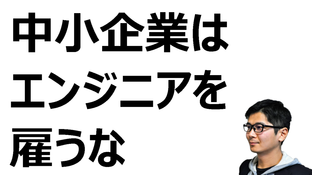 中小企業はエンジニアを雇うな公開済み 2018年12月4日 寸法 1280 × 720 in (インチ) 中小企業は「IT化をするためにエンジニアを雇う」という発想をやめよう!. https://watanabe-office.biz/wp-content/uploads/2018/12/中小企業はエンジニアを雇うな-1024x576.png